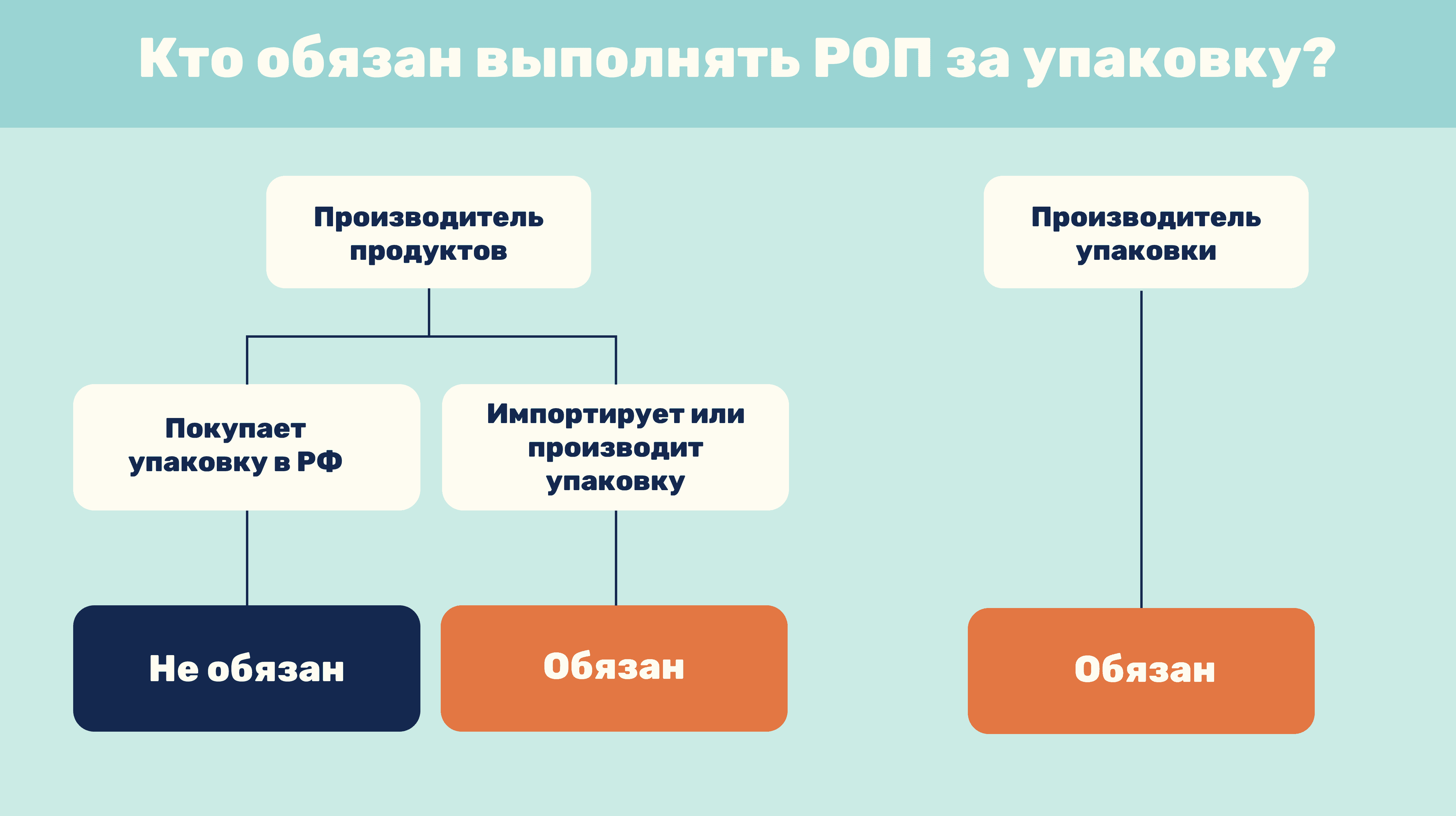 Проще говоря, платит тот, кто первым ввел упаковку в оборот на территории РФ в качестве товара. Если упаковка произведена в России – платит ее производитель. Если упаковка ввезена из-за рубежа – платит импортер. Роль конечного производителя пищевого продукта теперь второстепенна: если он закупает упаковку у российских производителей, то именно эти производители уже заложат затраты РОП в свою деятельность. Зато когда пищевая компания импортирует упаковку или готовые ингредиенты в упаковке, она сама выступает в роли импортера и должна отчитаться за эту тару.